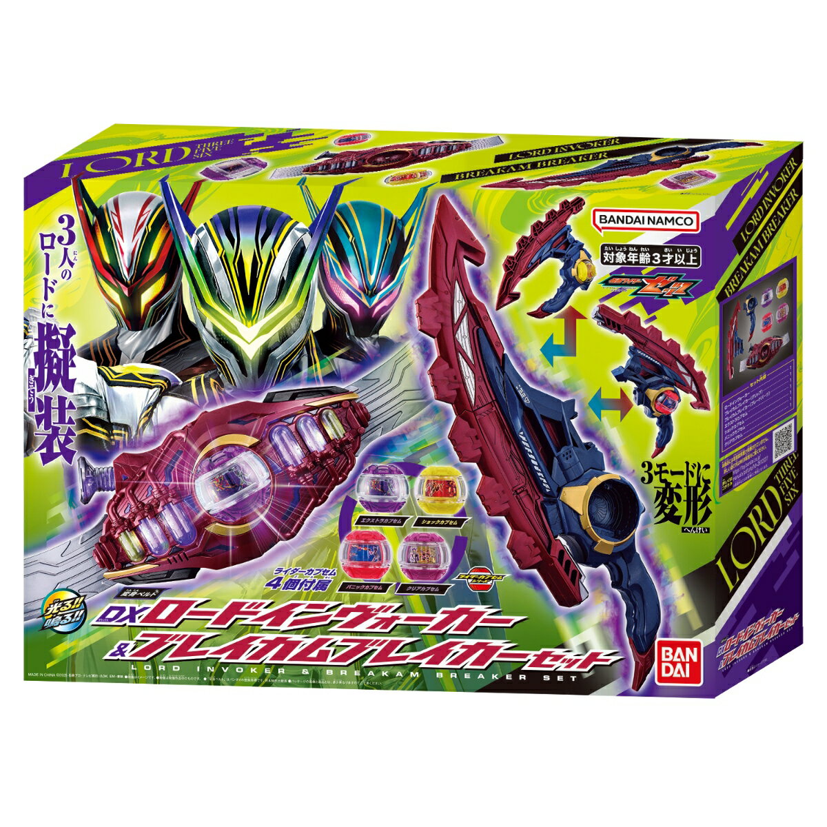 『仮面ライダーゼッツ』より、「変身ベルト DXロードインヴォーカー&ブレイカムブレイカーセット」が登場!「変身ベルト DXロードインヴォーカー」、「DXブレイカムブレイカー」がセットになった、3人のロードになりきれるスペシャルセットです。カプセム4個付属。■変身ベルト DXロードインヴォーカー付属の「エクストラカプセム」、「ショックカプセム」、「パニックカプセム」、「クリアカプセム」をそれぞれベルトにセットすることで、ロードスリー、ロードファイブ、ロードシックスへの擬装遊び、必殺技遊び、クリアカプセムのパワー解放遊びが楽しめます。■DXブレイカムブレイカーブレードパーツの付け替えで、ブレードモード・ナックルモード・シュートモードの3つのモードに変形!「ブレイカムブレイカー」のトリガーを引くと攻撃音が発動し、さらにカプセムをセットして回転させると必殺技が発動します。モードに応じて攻撃音や必殺技音が変化![セット内容]・ロードインヴォーカー本体…1・ブレイカムブレイカー…1・エクストラカプセム…1・ショックカプセム…1・パニックカプセム…1・クリアカプセム…1[使用電池]・単4乾電池×3本(別売り)・LR44×3個(付属)(本商品のセット内容以外は付属しません。)【対象年齢】:3才〜